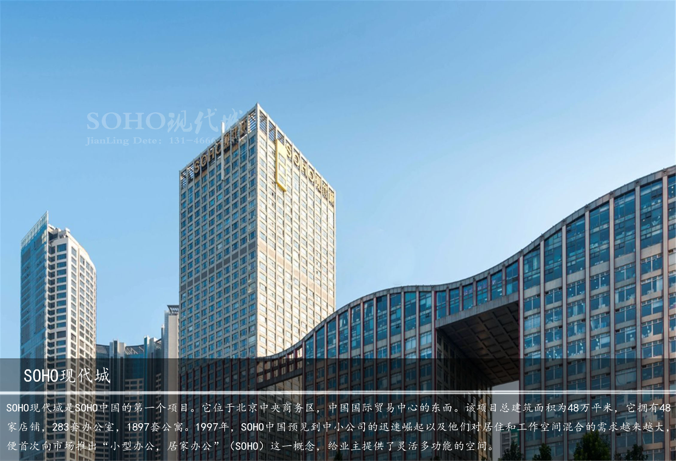 SOHO現(xiàn)代城是SOHO中國的第一個項目。它位于北京中央商務(wù)區(qū),中國國際貿(mào)易中心的東面。該項目總建筑面積為48萬平米,它擁有48家店鋪,283套辦公室,1897套公寓。1997年,SOHO中國預(yù)見到中小公司的迅速崛起以及他們對居住和工作空間混合的需求越來越大,便首次向市場推出“小型辦公,居家辦公”(SOHO)這一概念,給業(yè)主提供了靈活多功能的空間。