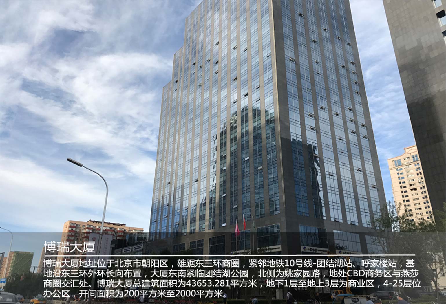 博瑞大廈地址位于北京市朝陽(yáng)區(qū),雄踞東三環(huán)商圈,緊鄰地鐵10號(hào)線-團(tuán)結(jié)湖站、呼家樓站,基地沿東三環(huán)外環(huán)長(zhǎng)向布置,大廈東南緊臨團(tuán)結(jié)湖公園,北側(cè)為姚家園路,地處CBD商務(wù)區(qū)與燕莎商圈交匯處。博瑞大廈總建筑面積為43653.281平方米,地下1層至地上3層為商業(yè)區(qū),4-25層位辦公區(qū),開(kāi)間面積為200平方米至2000平方米。