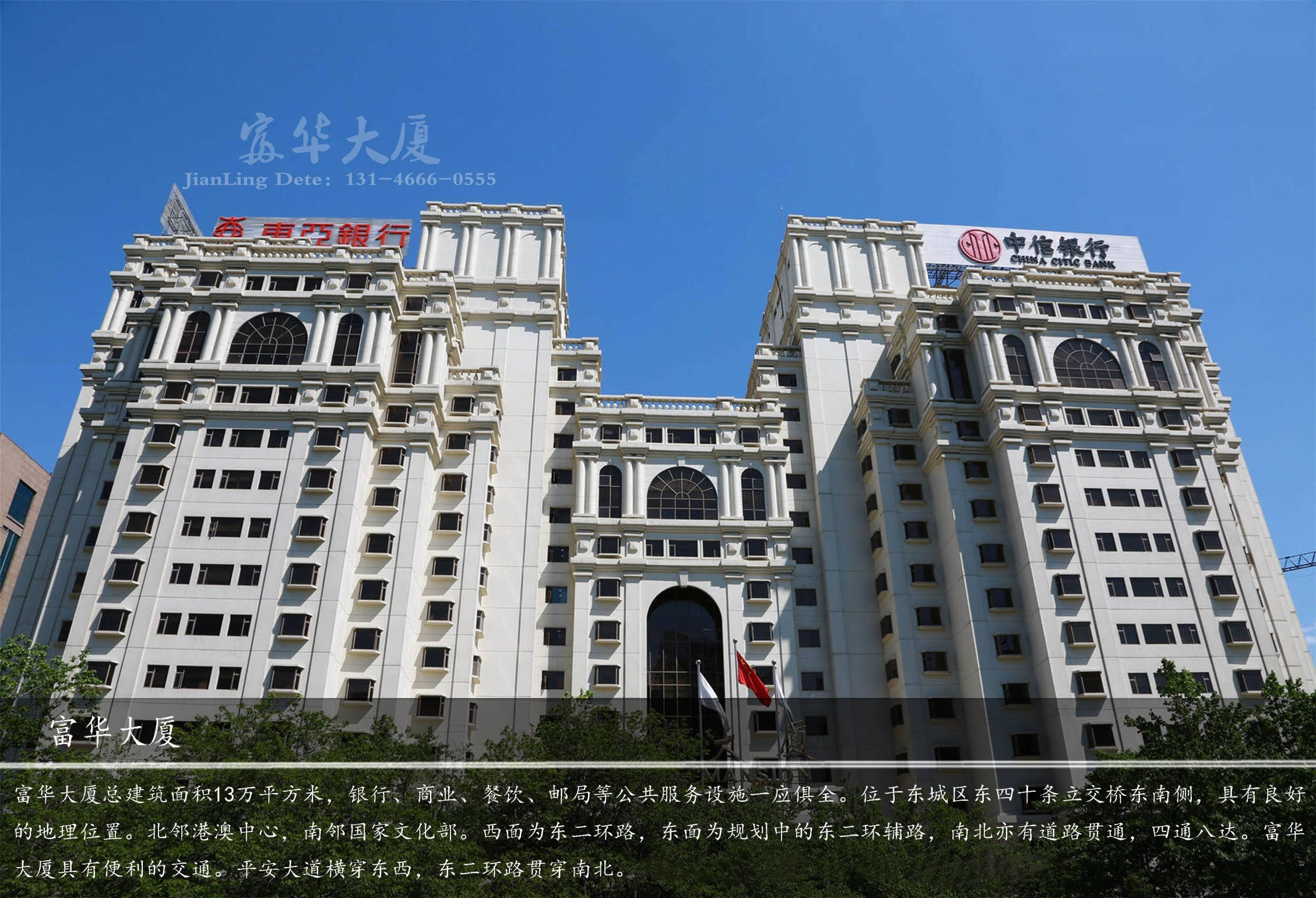 富華大廈項(xiàng)目大廈總建筑面積13萬(wàn)平方米,銀行、商鋪、餐飲、郵局等公共服務(wù)設(shè)施一應(yīng)俱全。富華大廈位于北京市東城區(qū)東四十條立交橋東南側(cè),具有良好的地理位置。北鄰港澳中心,南鄰國(guó)家文化部。西面為東二環(huán)路,東面為規(guī)劃中的東二環(huán)輔路,南北亦有道路貫通,四通八達(dá)。富華大廈具有便利的交通。平安大道橫穿東西,東二環(huán)路貫穿南北。北側(cè)即為地鐵東四十條站,公交線路多達(dá)數(shù)十條。