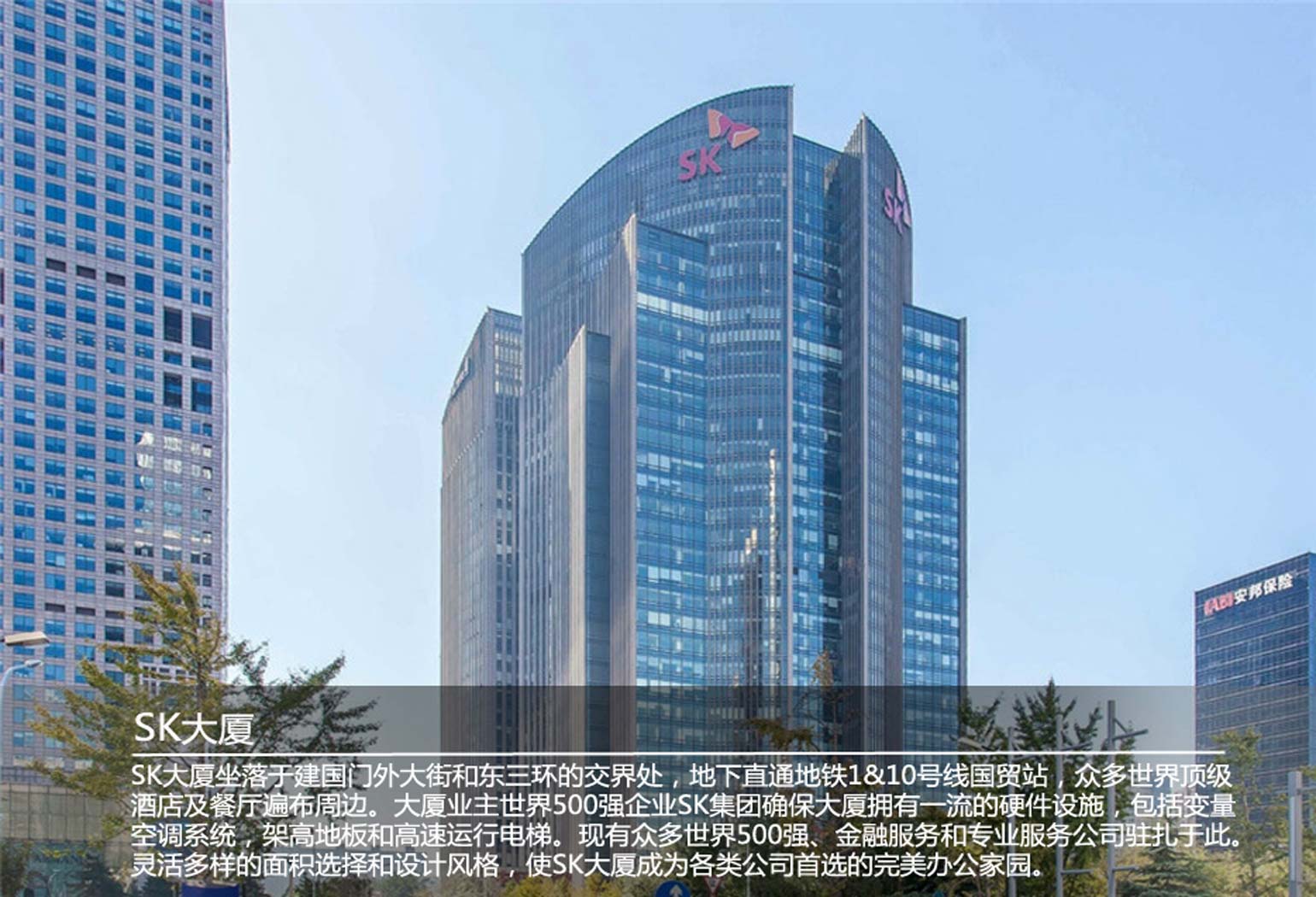 SK大廈坐落于建國(guó)門外大街和東三環(huán)的交界處,地下直通地鐵1&10號(hào)線國(guó)貿(mào)站,眾多世界酒店及餐廳遍布周邊。大廈業(yè)主世界500強(qiáng)企業(yè)SK集團(tuán)確保大廈擁有的硬件設(shè)施,包括變量空調(diào)系統(tǒng),架高地板和高速運(yùn)行電梯。現(xiàn)有眾多世界500強(qiáng)、金融服務(wù)和專業(yè)服務(wù)公司駐扎于此。靈活多樣的面積選擇和設(shè)計(jì)風(fēng)格,使SK大廈成為各類公司首選的完美辦公家園。周圍遍布國(guó)貿(mào)中心、銀泰中心、IFC大廈等多座甲級(jí)寫字樓。世界500強(qiáng)和跨國(guó)公司總部、國(guó)際金融機(jī)構(gòu)、咨詢公司等集中在該商務(wù)圈,是國(guó)際經(jīng)濟(jì)文化交流的中心。該商務(wù)圈以商務(wù)辦公為主,商務(wù)配套設(shè)施成熟完善,包括國(guó)貿(mào)商場(chǎng)和面向大眾消費(fèi)的建外SOHO商鋪街。