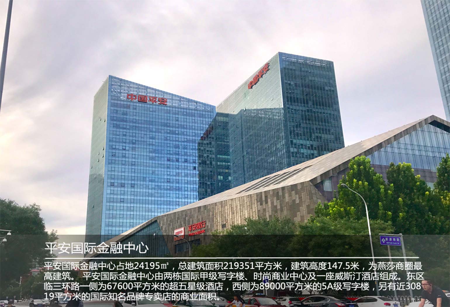 平安國際金融中心由兩棟國際甲級寫字樓、時尚商業(yè)中心及一座威斯汀酒店組成。東區(qū)臨三環(huán)路一側為67600平方米的超五星級酒店,西側為89000平方米的5A級寫字樓,另有近30819平方米的國際知名品牌專賣店的商業(yè)面積。