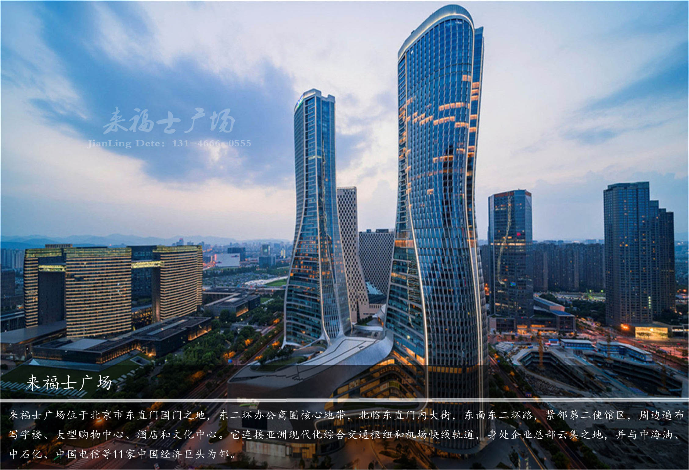 北京來福士中心位于北京市東直門國門之地,東二環(huán)辦公商圈核心地帶,北臨東直門內(nèi)大街,東面東二環(huán)路,緊鄰第二使館區(qū),周邊遍布寫字樓、大型購物中心、酒店和文化中心。它連接亞洲現(xiàn)代化綜合交通樞紐和機(jī)場快線軌道,身處企業(yè)總部云集之地,并與中海油、中石化、中國電信等11家中國經(jīng)濟(jì)巨頭為鄰。憑借軌道交通及近在咫尺的東二環(huán)、機(jī)場高速,便捷的交通網(wǎng)絡(luò)和地理位置,北京來福士中心將會(huì)極大提升京城東北部市民的生活工作品質(zhì)。