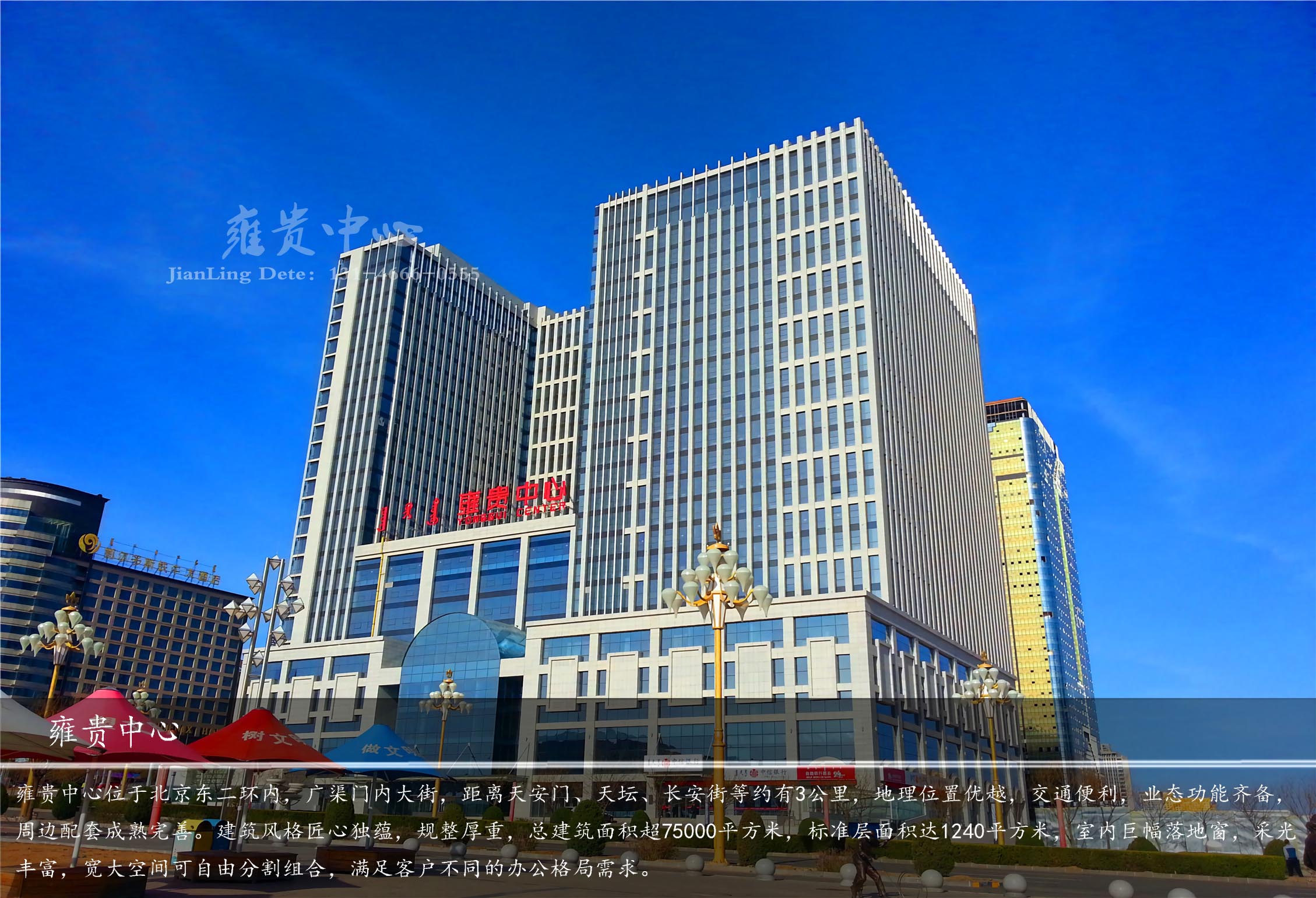 雍貴中心位于北京東二環(huán)內(nèi),廣渠門內(nèi)大街,距離天安門、天壇、長安街等約有3公里,地理位置優(yōu)越,交通便利,業(yè)態(tài)功能齊備,周邊配套成熟完善。建筑風(fēng)格匠心獨(dú)蘊(yùn),規(guī)整厚重,總建筑面積超75000平方米,標(biāo)準(zhǔn)層面積達(dá)1240平方米,室內(nèi)巨幅落地窗,采光豐富,寬大空間可自由分割組合,滿足客戶不同的辦公格局需求。四棟高樓圍系中庭水榭,旁植綠色生態(tài),為客戶打造花園式辦公環(huán)境,使雍貴中心商業(yè)價(jià)值和市場價(jià)值不可限量。